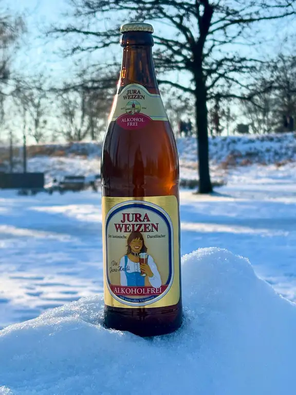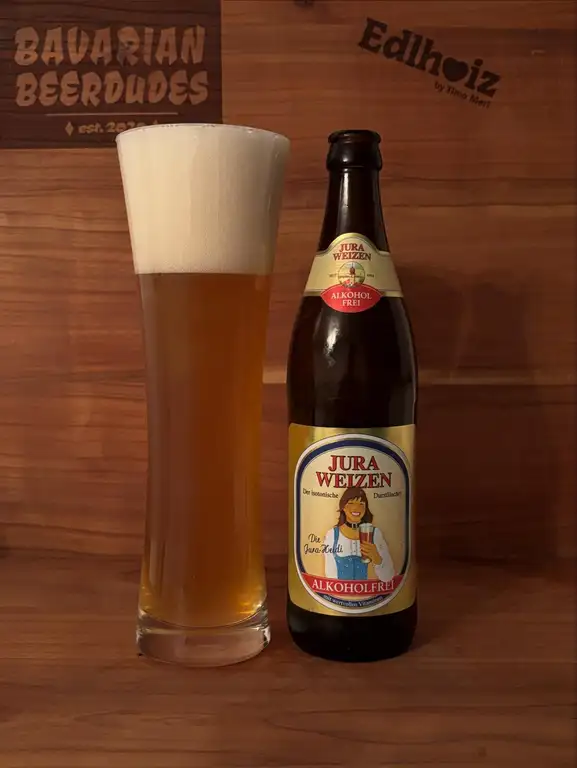 Aus dem Glas leuchtet uns das Bier in einem schönen hefetrüben Goldfarbton entgegen. Es bringt eine sehr feinporige Schaumblume mit, von der ein Finger breit bis zum Schluss auf dem Bier verbleibt. Es riecht frisch, getreidig und hefig mit sanfter Esterfruchtigkeit, Bananennote sind nur sehr zart wahrnehmbar, Zitrusaromen dafür umso mehr. Der Antrunk ist ausgesprochen weich. Das Weizenmalz steht im Vordergrund, die Hefe ist weiterhin auf der Zunge zu spüren, dazu kommen etwas Nelke und sehr hauchfeine Herbe. Die Rezenz prickelt am Gaumen und im Mund macht sich eine ausschweifende Frische breit. Auch mal positiv hervorheben muss man was NICHT vorhanden ist, nämlich eine zu hohe Restsüße wie es bei vielen Gärstoppern der Fall ist. Auch der oft vorhandene Maischegeschmack fällt so weg. Das Jura Alkoholfrei geht geschmacklich schon eher Richtung Leichtes Weißbier. Schön gemacht! Am Ende legt es einen rasant süffigen und durstlöschende Abgang hin. Hefe und Würze klingen am Schluss harmonisch aus.