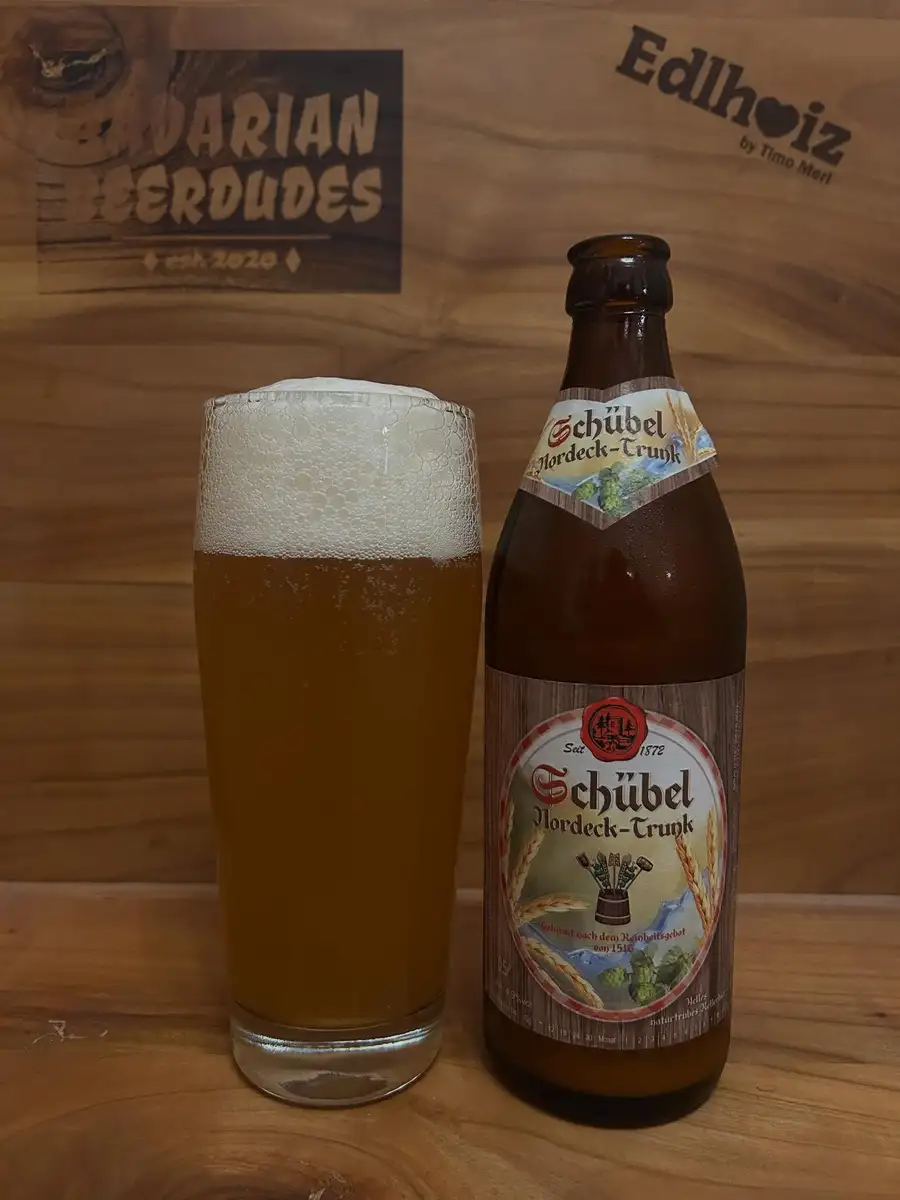 Wir sind mal wieder in Stadtsteinach im oberfränkischen Landkreis Kulmbach, bei der Brauerei Schübel. In unsere Willybecher fließt Heute der Nordeck-Trunk, ein Kellerbier/Zwickl! Im Glas präsentiert sich uns ein unfiltriertes goldgelb leuchtendes Zwickl, welches von einer prächtigen fein bis mittelporigen und leicht beigen Schaumblume bedeckt wird. In der Nase vernehmen wir leicht süßliche Malzaromen, eine feine Würzigkeit und leicht hefefruchtige Noten.
