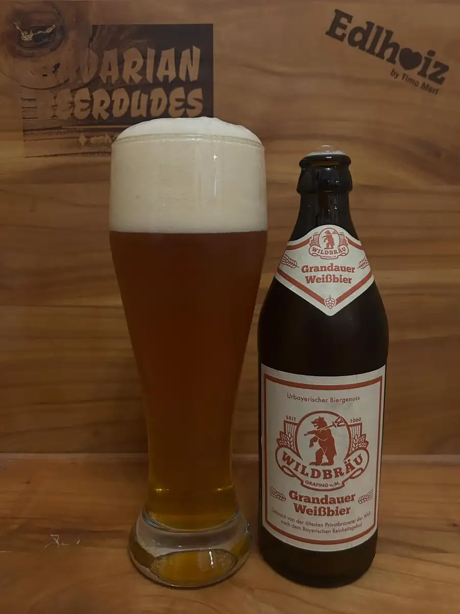 Wir sind heute im oberbayerischen Grafing bei München. Hier ist die Wildbräu zuhause und braut unter anderem das Grandauer Weissbier! Im Weissbierstutzen steht es wunderbar hefetrüb und in einem leuchtenden Orangegold. Gekrönt wird es von einer imposanten, extrem stabilen, absolut cremigen und schneeweißen Schaumkrone. In der Nase vernehmen wir in erster Linie hefefruchtige Aromen nach reifen Bananen und leichte Nelkennoten. Dazu gesellen sich feine süßliche Malzaromen.