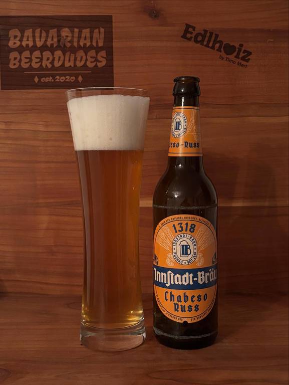 Der Innstadt Chabeso Russ zeigt sich in hellem, leicht trübem Gelb mit stabiler, feinporiger Schaumkrone. In der Nase dominieren fruchtige Aromen von Banane und Zitrone, begleitet von leichter Hefewürze und säuerlicher Chabeso-Note. Der erste Schluck ist spritzig und erfrischend, die Balance zwischen Bier und Limo harmonisch, am Gaumen verbinden sich malzige Weizenaromen mit der zitronigen, leicht süßen Limo, begleitet von feiner Hefewürze. Der Abgang ist mild, leicht säuerlich und kurz, hinterlässt ein dezentes Fruchtaroma und macht Lust auf den nächsten Schluck.